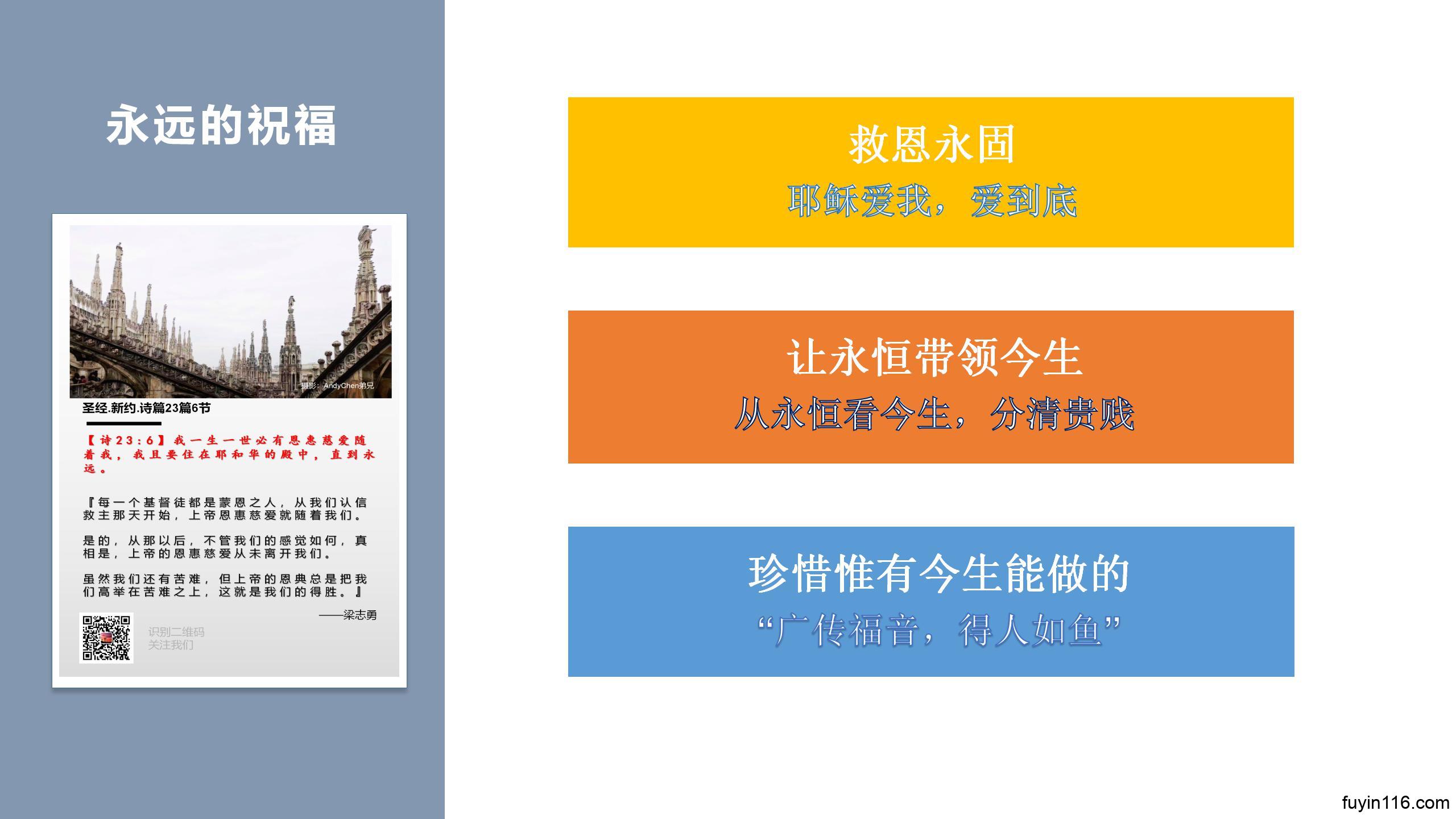 求主祝福我们的《诗篇23篇》系列讲道录音,让我们所讲的,能帮助弟兄姊妹看见基督,能让更多的心灵得到安慰和激励。