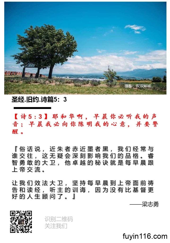 【诗5:3】耶和华啊,早晨你必听我的声音;早晨我必向你陈明我的心意,并要警醒。