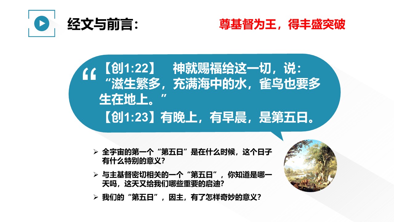 2月2日的主日,正好是我们农历新年的“正月初五”,让我们特别思想“第五日”有什么特别的意义。