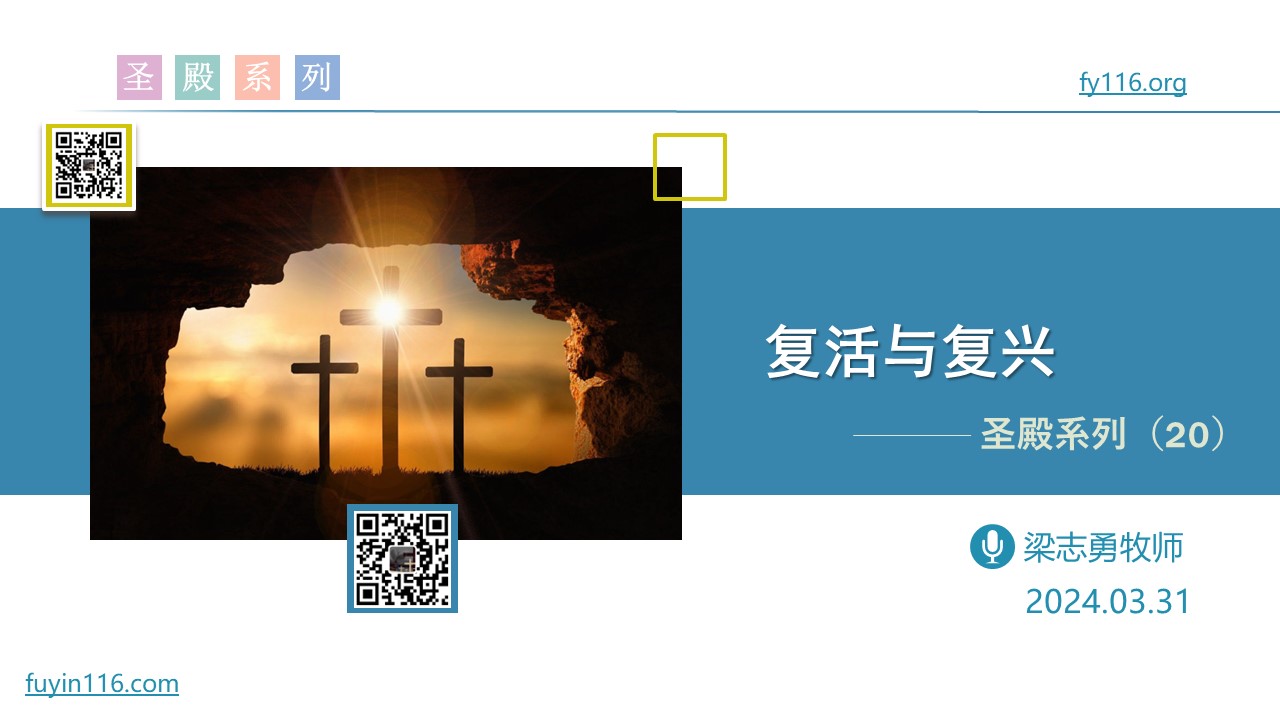 3月31日是一个重要的节日,而且不仅是基督徒的,也是全世界最重要的节日——复活节,我们要分享的主题是: 《复活与复兴》 “基督的复活”这个历史事件,到底有何意义? 基督的复活,与圣殿的重建复兴,有什么关系? 将近两千年前的复活,对今天的我们,有何重要影响?   愿上帝的祝福借着祂的真道,更多地临到每一个认真聆听的灵魂。 欢迎您收听: 《复活与复兴》 https://lmqf116.top/aw4q 您也可以点击下面的链接,重温之前的信息: 《圣殿系列》 点击下面链接,推荐收听:《因信称义系列》 第16、…